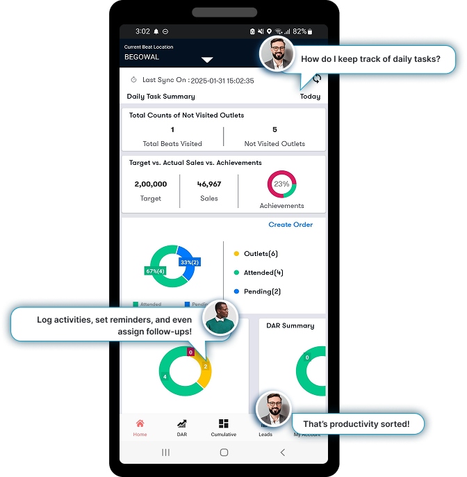 Efficiently capture and manage leads with real-time tracking and approvals. The system records order booking timestamps and coordinates for enhanced salesforce control.